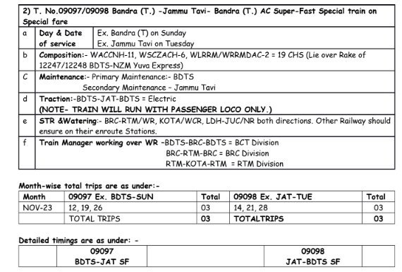 09097 बान्द्रा टर्मिनस से दिनांक 12 से 26 नवम्बर के बीच प्रत्येक रविवार को जम्मूतवी के लिए 21:50 को रवाना होगी और वापसी में 09098 जम्मूतवी से दिनांक 14 से 28 नवम्बर तक प्रत्येक मंगलवार 23:20 को बान्द्रा टर्मिनस के लिए रवाना होगी।