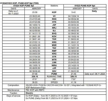 01024 कोल्हापुर पुणे विशेष एक्सप्रेस दिनांक 05 नवम्बर से 31 दिसम्बर तक प्रतिदिन और 01023 पुणे कोल्हापुर विशेष एक्सप्रेस दिनांक 06 नवम्बर से 01 जनवरी 2024 तक प्रतिदिन निम्नलिखित समयसारणी के अनुसार चलेगी।