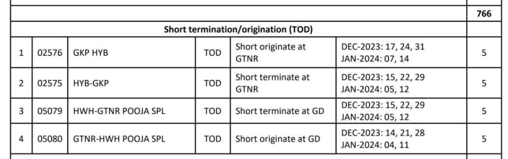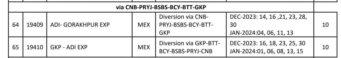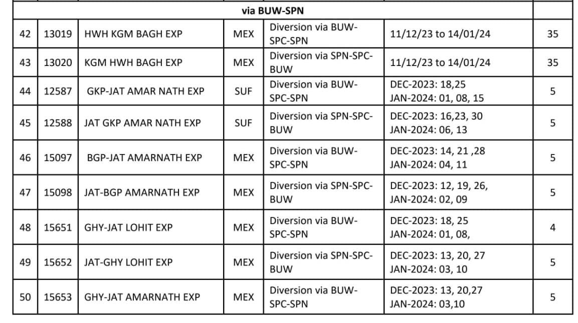परावर्तित मार्ग :- 6) कानपुर – प्रयागराज जंक्शन – बनारस – वाराणसी सिटी – भटनी – गोरखपुर होकर चलनेवाली गाड़ियाँ