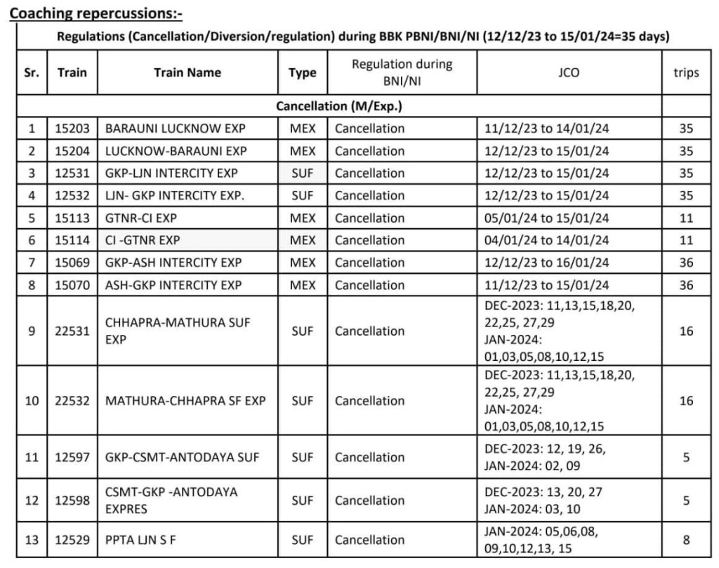 उ रे NR में बाराबंकी – अयोध्या – शाहगंज – जाफ़राबाद रेल मार्ग दोहरीकरण अंतर्गत बाराबंकी रेल यार्ड रिमॉडलिंग हेतु 11 दिसम्बर 2023 से 16 जनवरी 2024 के बीच, छत्तीस दिनोंका रेल ब्लॉक लिया जा रहा है। उपरोक्त तिथियों में 44 मेल/एक्सप्रेस गाड़ियोंके फेरे पूर्णतः रद्द रहेंगे। 67 मेल/एक्सप्रेस गाड़ियाँ अपने नियमित रेल मार्ग में, बाराबंकी होकर नही गुजरेंगी, अन्य 7 अलग अलग मार्ग से चलाई जाएंगी। यात्रीगण से निवेदन है, कृपया निम्नलिखित परिपत्रक देख कर अपनी रेल यात्रा का नियोजन करें। परिपत्रक में गाड़ी क्रमांक, गाड़ी का नाम, प्रकार, ब्लॉक के अवधि में अवस्था, JCO गाड़ी के प्रारम्भिक स्टेशन से छूटने की तिथि एवं बाधित फेरों की संख्या इस तरह रचना की गई है।