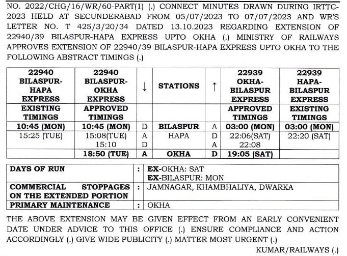 रेल मुख्यालय ने 22940/39 बिलासपुर हापा बिलासपुर साप्ताहिक सुपरफास्ट एक्सप्रेस का विस्तार हापा से आगे ओखा तक करने का निर्णय लिया है। हापा से आगे यह गाड़ी जामनगर, खम्भालीया और द्वारका स्टेशनोंपर ठहराव लेंगी।