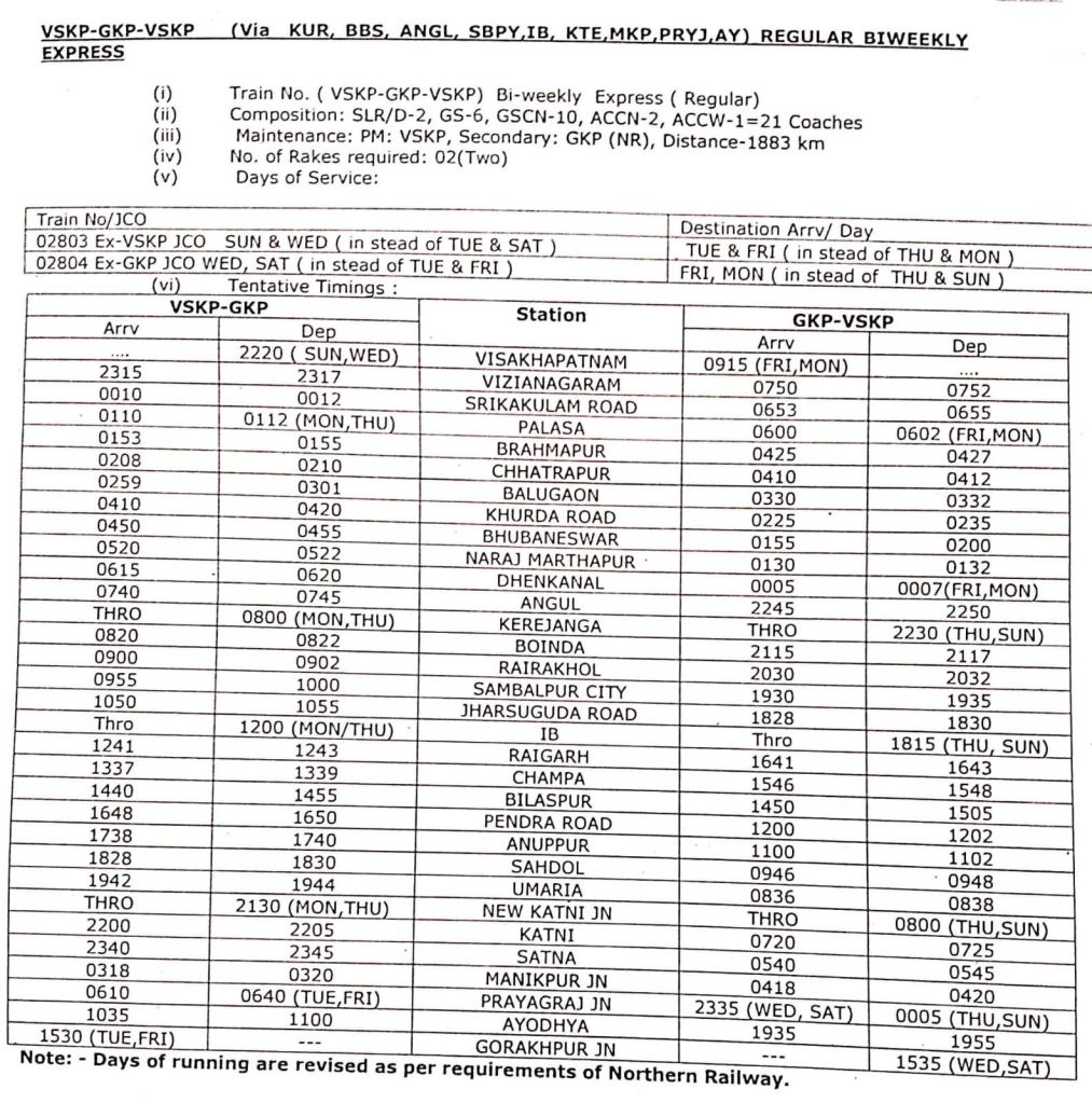 02803/04 विशाखापट्टनम गोरखपुर विशाखापट्टनम द्विसाप्ताहिक विशेष