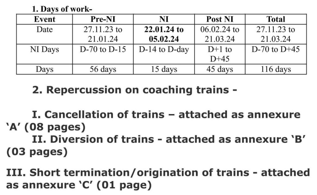 उपरोक्त रेल ब्लॉक में बाधित रेल गाड़ियोंके सूची में, उपरे से गुजरनेवाली गाड़ियोंके सम्भन्ध में उ.प.रे. का जारी हुवा परिपत्रक