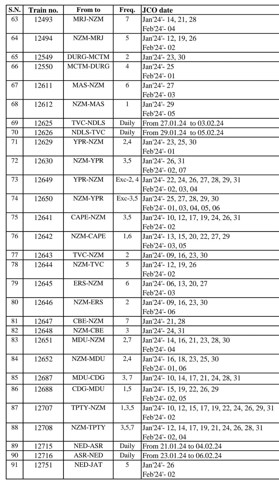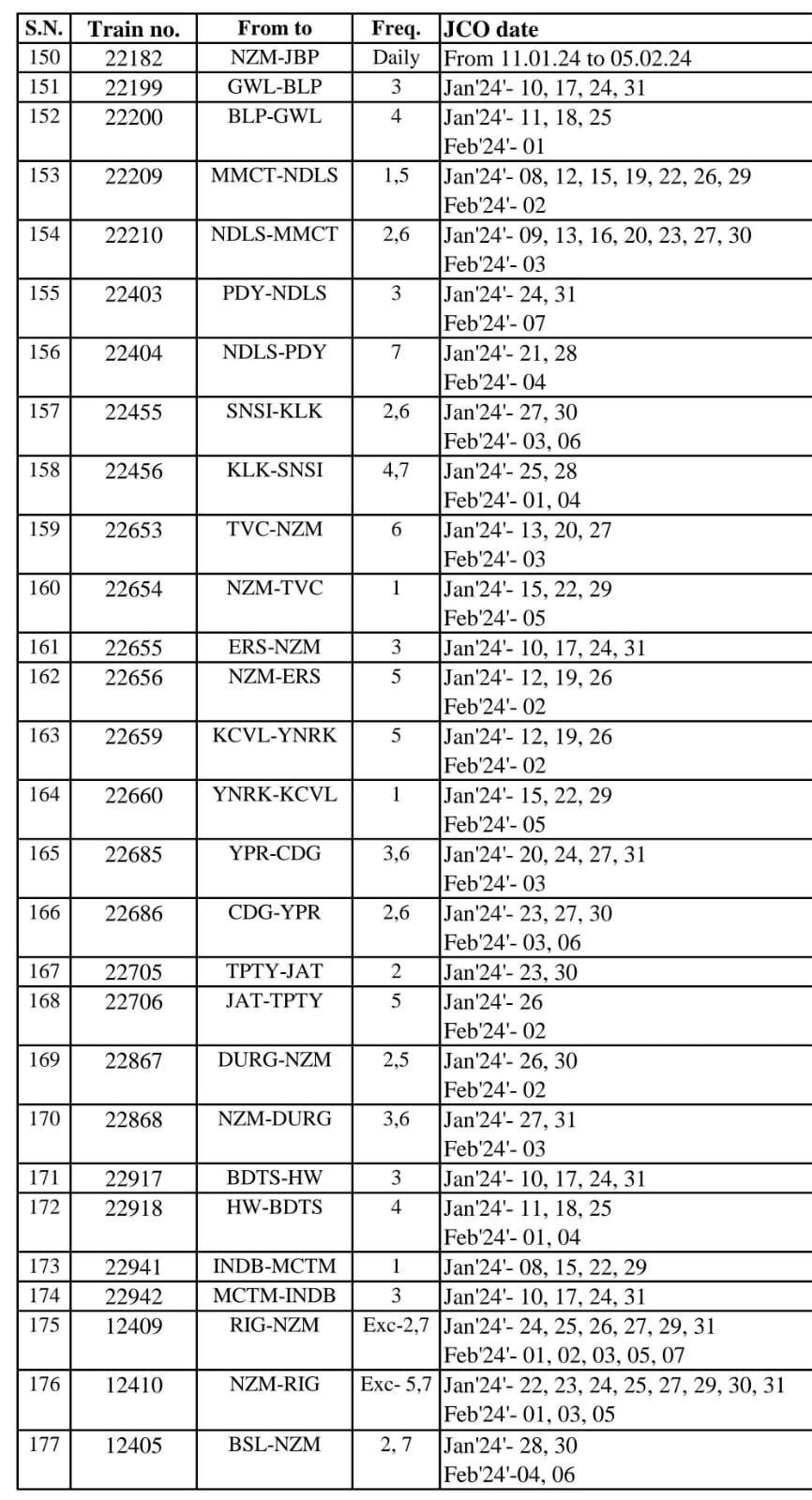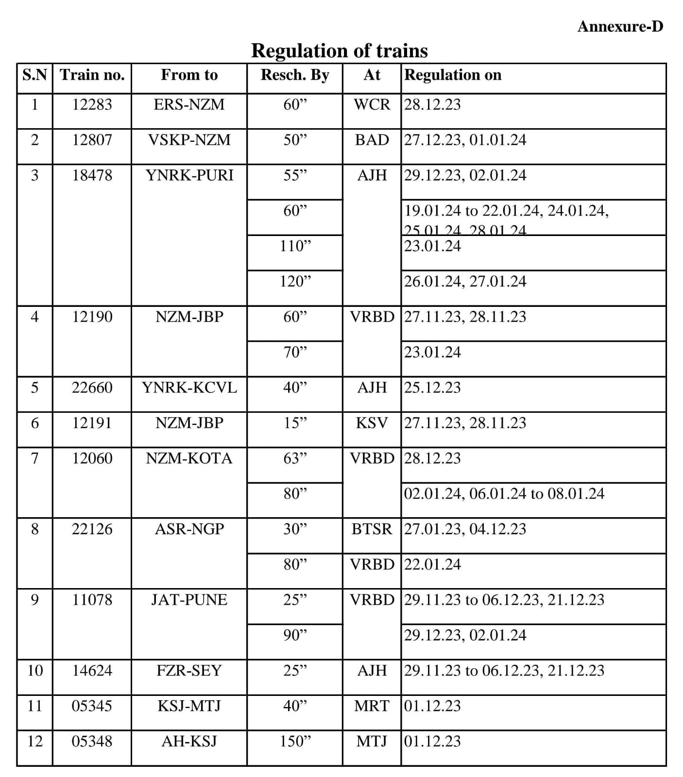 निम्नलिखित 12 गाड़ियोंको मार्ग में रेग्युलेट किया जाएगा।