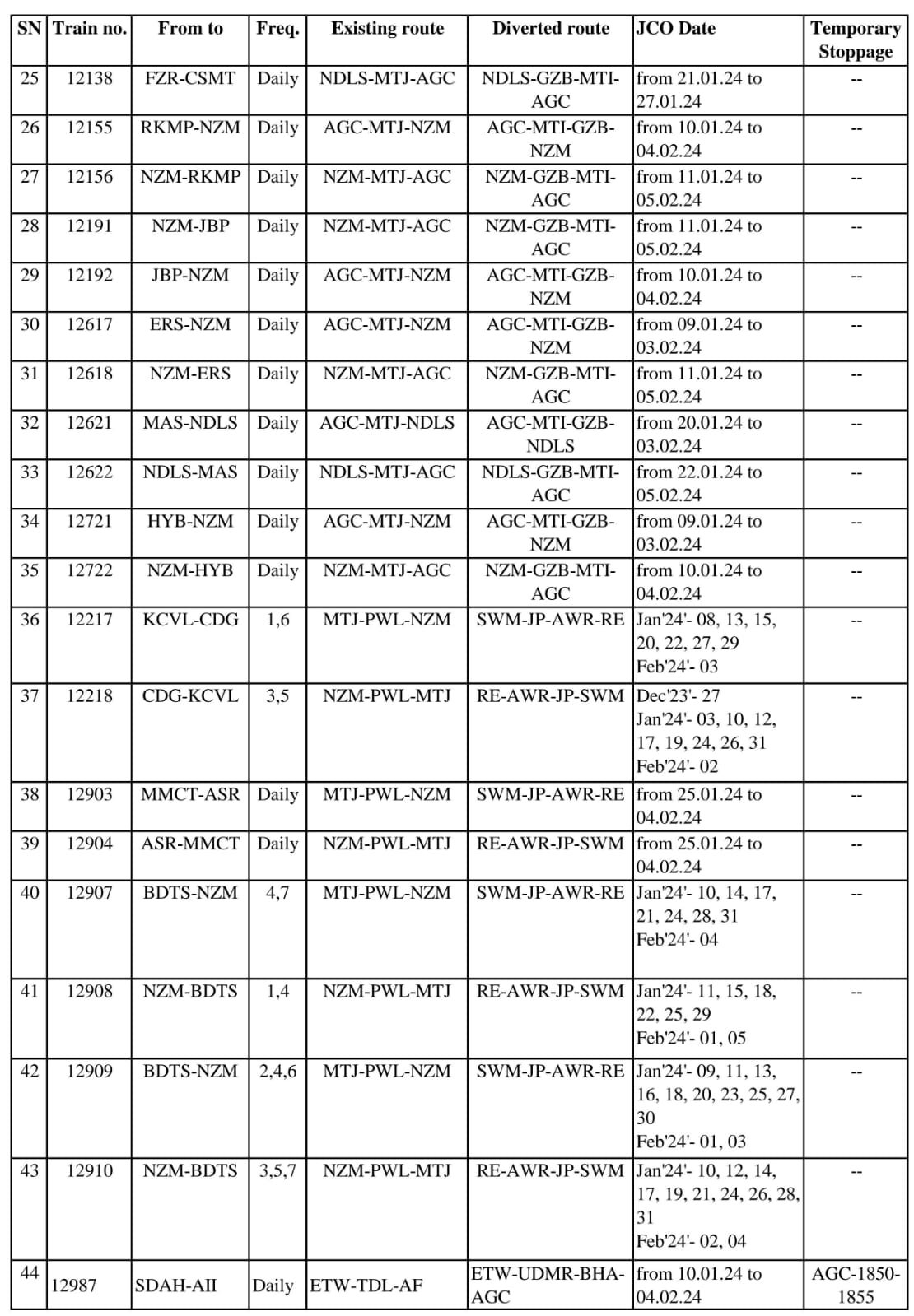 नियमित मार्ग से परावर्तित होकर चलनेवाली 59 गाड़ियाँ :