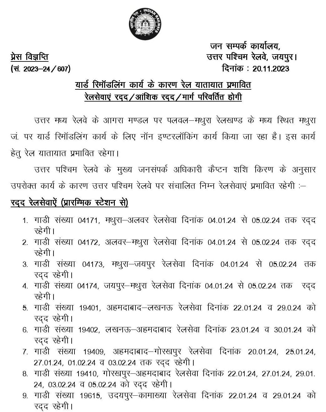 मथुरा जंक्शन, जहाँ से रेल के सात रेल मार्ग निकलते है, भारतीय रेल्वेज़ का बहुत महत्वपूर्ण जंक्शन स्टेशन है। उत्तर मध्य रेल में आग्रा मण्डल स्थित मथुरा जंक्शन के यार्ड की रिमॉडलिंग की जानी है। 234 गाड़ियाँ रद्द, 59 गाड़ियोंका मार्ग परिवर्तन, 14 गाड़ियाँ आँशिक रद्द और 12 गाड़ियोंका रेग्युलेशन इतने अस्थायी बदलावोंकी सूचना हमे प्राप्त हुई है, जिसे हम प्रस्तुत कर रहे है। यात्रिओंसे निवेदन है, उपरोक्त अवधी के दौरान, मथुरा होकर रेल मार्ग से यात्रा करना चाहते है तो कृपया रेल विभाग की हेल्पलाइन 139, अधिकृत वेबसाइट, ऍप द्वारा जानकारी लेकर ही अपनी यात्रा का नियोजन करें।