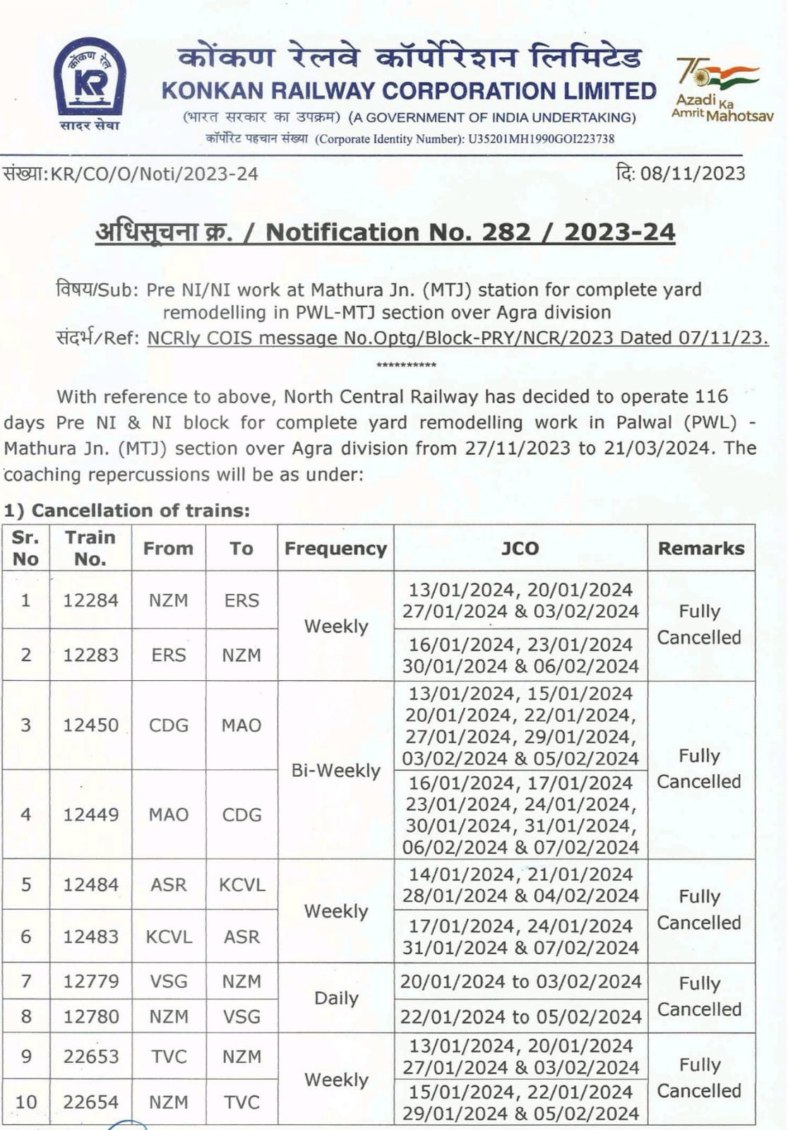 उपरोक्त रेल ब्लॉक में बाधित रेल गाड़ियोंके सूची में, कोंकण रेलवे से गुजरनेवाली गाड़ियोंके सम्भन्ध में परिपत्रक,