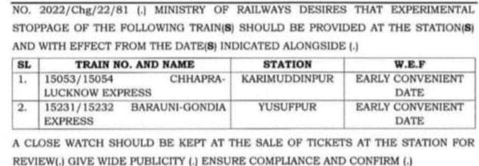 उपरोक्त स्टोपेजेस की घोषणा हो चुकी है, तिथि की घोषणा स्थानीय रेल प्रशासन करेगा।