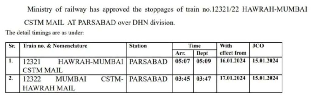 2: 12321/22 हावड़ा छत्रपति शिवाजी महाराज टर्मिनस मुंबई हावड़ा मेल का, धनबाद मंडल के परसाबाद में 15/1/2024 से दोनों दिशाओं में स्टॉपेज शुरू होगा।