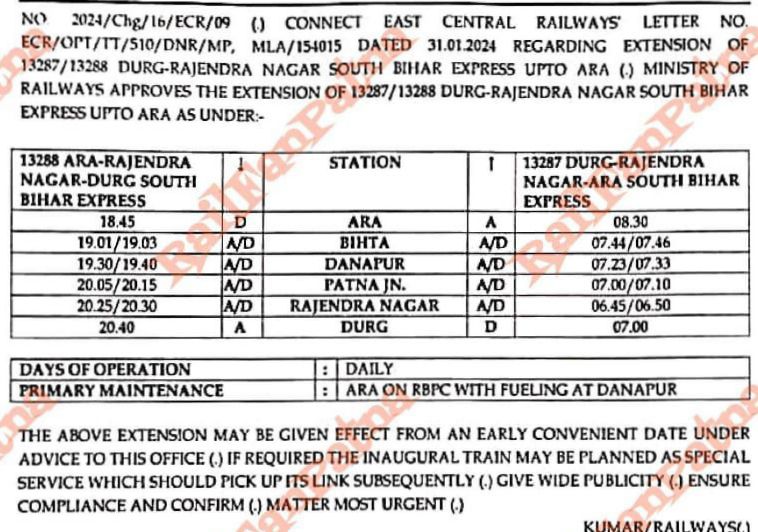 13287/88 दुर्ग-राजेंद्र नगर – दुर्ग साउथ बिहार प्रतिदिन एक्सप्रेस का आरा जंक्शन तक विस्तार किया जा रहा है। इस विस्तार के कारण यात्रिओंको पटना जंक्शन से सीधा संपर्क मिल जाएगा। सैटेलाइट टर्मिनल्स के चलते मुख्य स्टेशन की जंक्शन सहूलियत से यात्री बिछड़े जाते है। जंक्शन स्टेशनोंसे कई मार्ग और अन्य गाड़ियोंके द्वारा यात्री अपने इच्छित गन्तव्य पर पहुंचने हेतु गाड़ी बदल सकता है। उक्त विस्तार के बाद राजेन्द्रनगर स्टेशन से आगे गाड़ी पटना जंक्शन, दानापुर, बिहटा होते हुए आरा पहुँचेंगी।