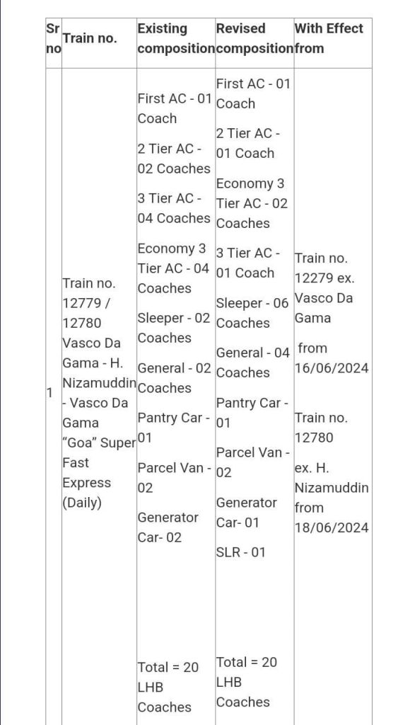 गोवा एक्सप्रेस में स्लिपर, साधारण कोच 02- 02 की जगह 06 और 04 किए जा रहे है। अर्थात वातानुकूल कोच टू टियर 02 की जगह 01, वातानुकूल थ्री टियर इकोनॉमी 04 की जगह 02 और वातानुकूल थ्री टियर 04 की जगह 01 रह जाएंगे। गाड़ी में कुल 20 कोच यथावत बने रहेंगे।