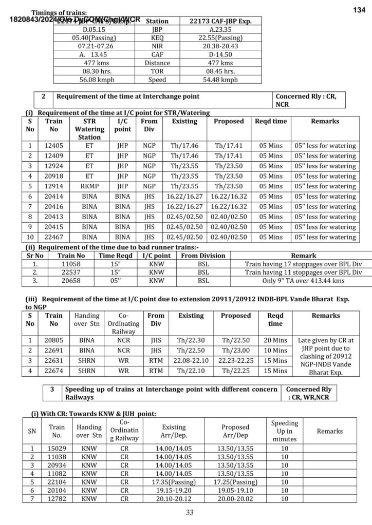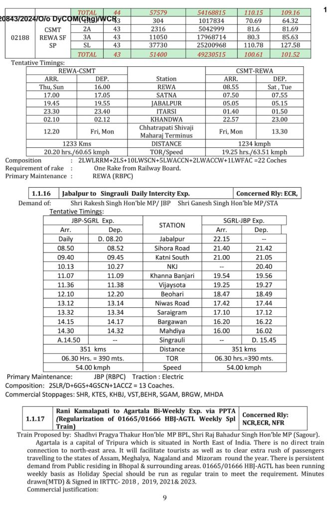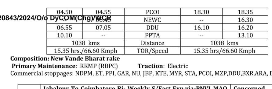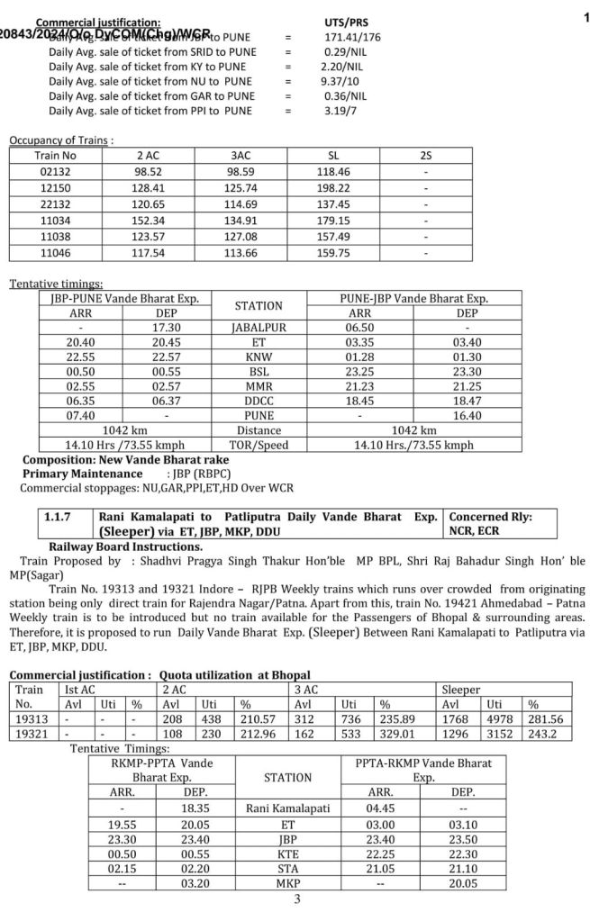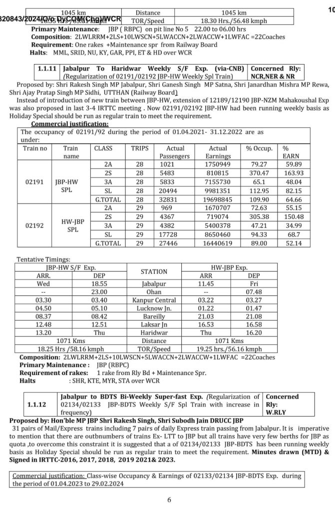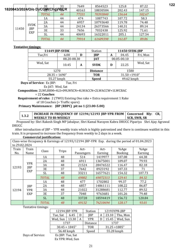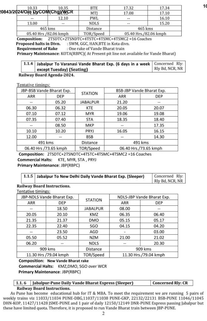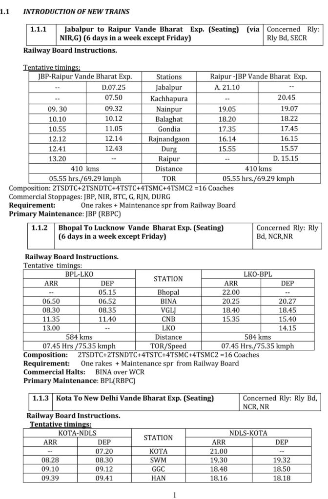1: जबलपुर रायपुर जबलपुर वन्देभारत (16 कोच) नैनपुर, बालाघाट, गोंदिया होकर, सप्ताह में 6 दिन