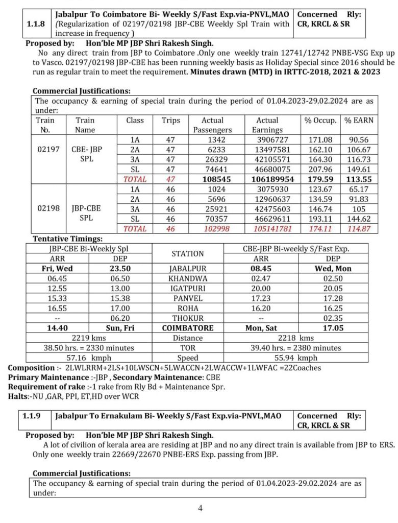 8: जबलपुर कोयम्बटूर जबलपुर द्विसाप्ताहिक वाया पनवेल मडगांव (पूर्व विशेष गाड़ी क्रमांक 02197/98 से परिचालित)