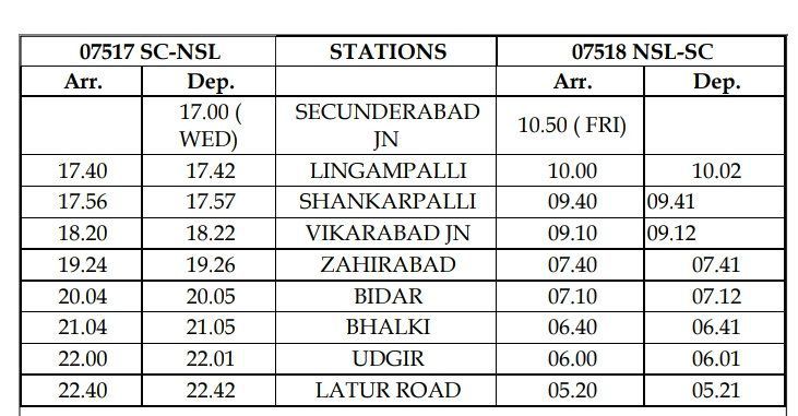 07517 सिकन्दराबाद से दिनांक 17 अप्रैल 2024 से 29 मई 2024 तक, प्रत्येक बुधवार को नागरसोल के लिए रवाना होगी और वापसी में 07518 नागरसोल से दिनांक 18 अप्रैल 2024 से 30 मई 2024 तक, प्रत्येक गुरुवार को सिकन्दराबाद के लिए रवाना होगी।