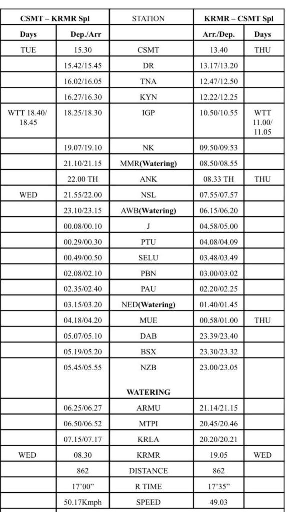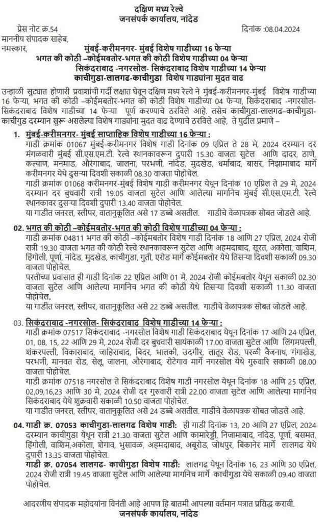 01067 मुम्बई छत्रपति शिवाजी महाराज टर्मिनस से दिनांक 09 अप्रैल 2024 से 28 मई 2024 तक, प्रत्येक मंगलवार को करीमनगर के लिए रवाना होगी और वापसी में 01066 करीमनगर से दिनांक 10 अप्रैल 2024 से 29 मई 2024 तक, प्रत्येक बुधवार को मुम्बई छत्रपति शिवाजी महाराज टर्मिनस के लिए रवाना होगी।
