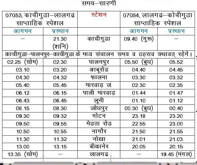07053 काचेगुड़ा से 13, 20 एवं 27 अप्रैल को लालगढ के लिए रवाना होगी और वापसी में 07054 लालगढ से 16, 23 एवं 30 अप्रैल को काचेगुड़ा के लिए रवाना होगी।
