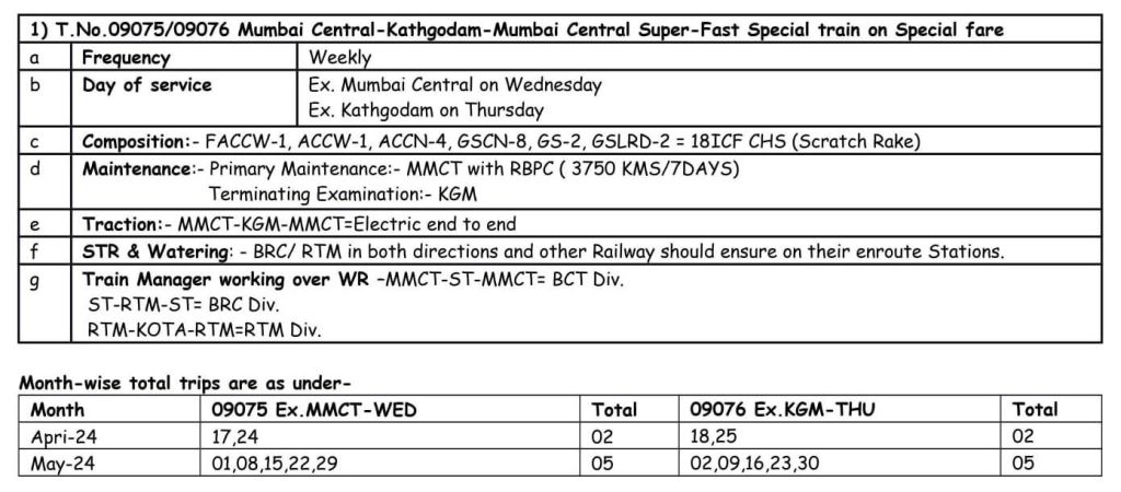 1: 09075/76 मुम्बई सेंट्रल काठगोदाम मुम्बई सेंट्रल सुपरफास्ट साप्ताहिक विशेष