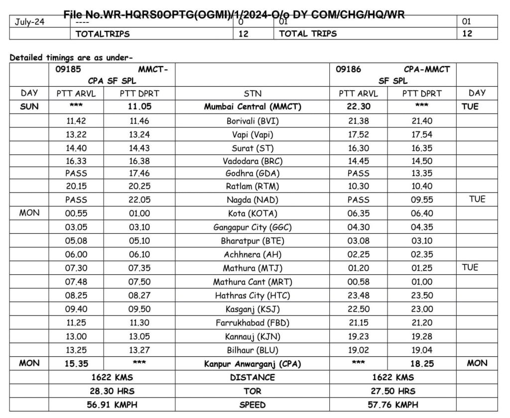 2: 09185/86 मुम्बई सेंट्रल कानपुर अनवरगंज मुम्बई सेंट्रल सुपरफास्ट साप्ताहिक विशेष