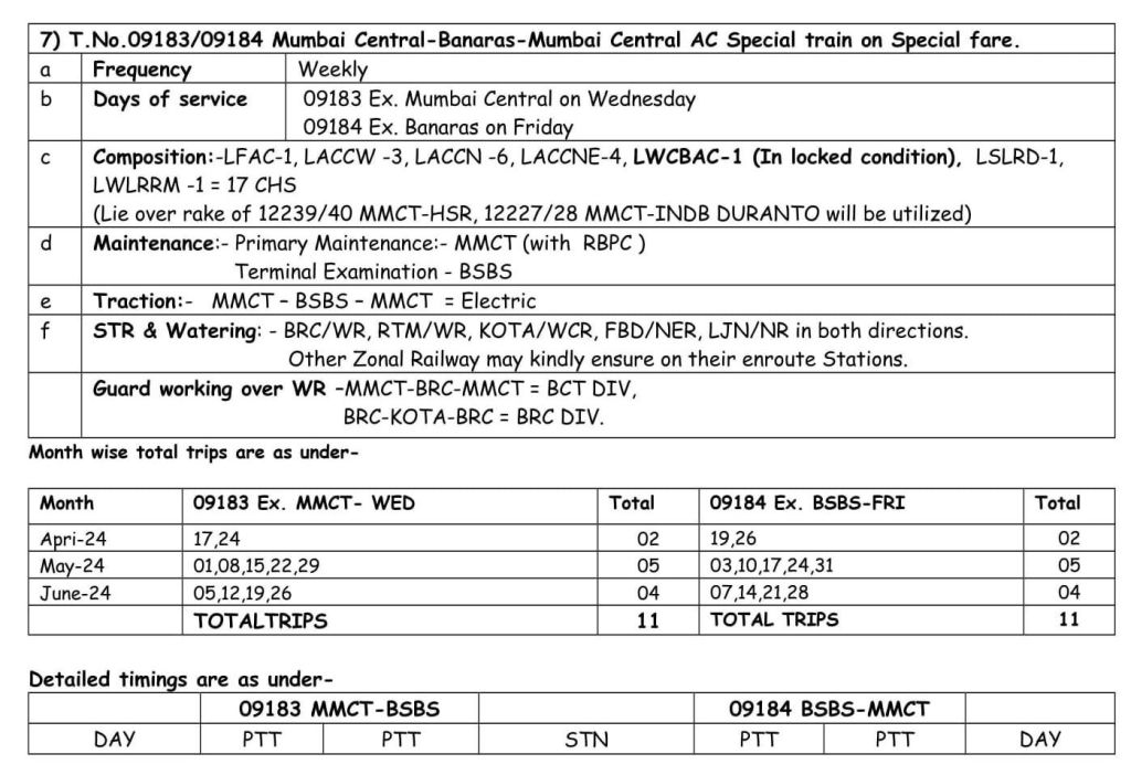 7: 09183/84 मुम्बई सेंट्रल बनारस मुम्बई सेंट्रल वातानुकूल सुपरफास्ट साप्ताहिक विशेष