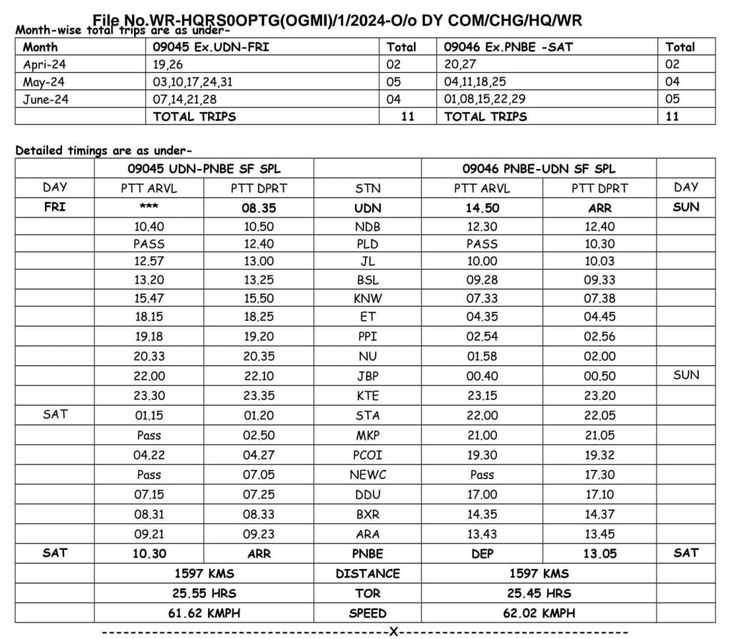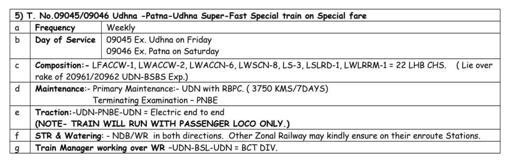 5: 09045/46 उधना पटना उधना साप्ताहिक विशेष वाया भुसावल, प्रयागराज छिंवकी