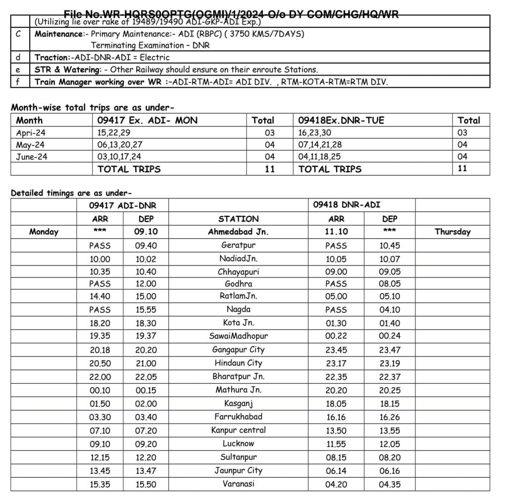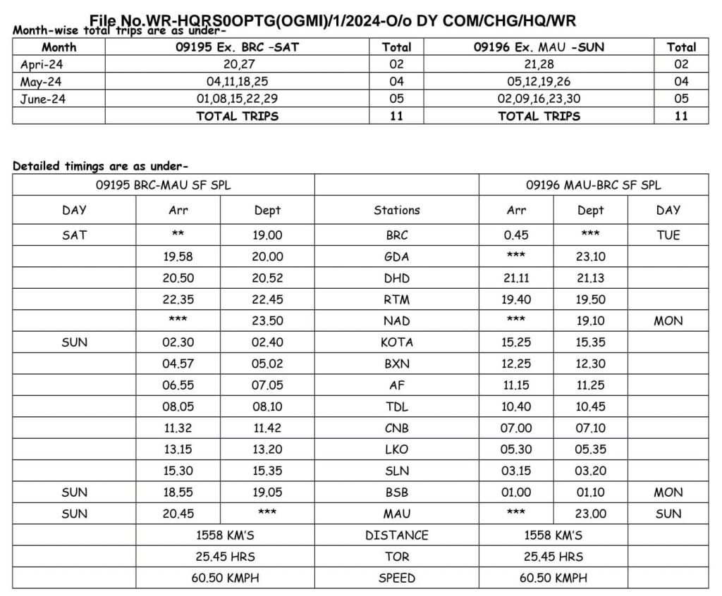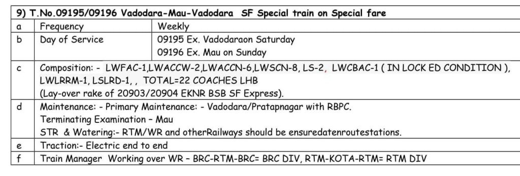 9: 09195/96 वडोदरा मउ वडोदरा सुपरफास्ट साप्ताहिक विशेष