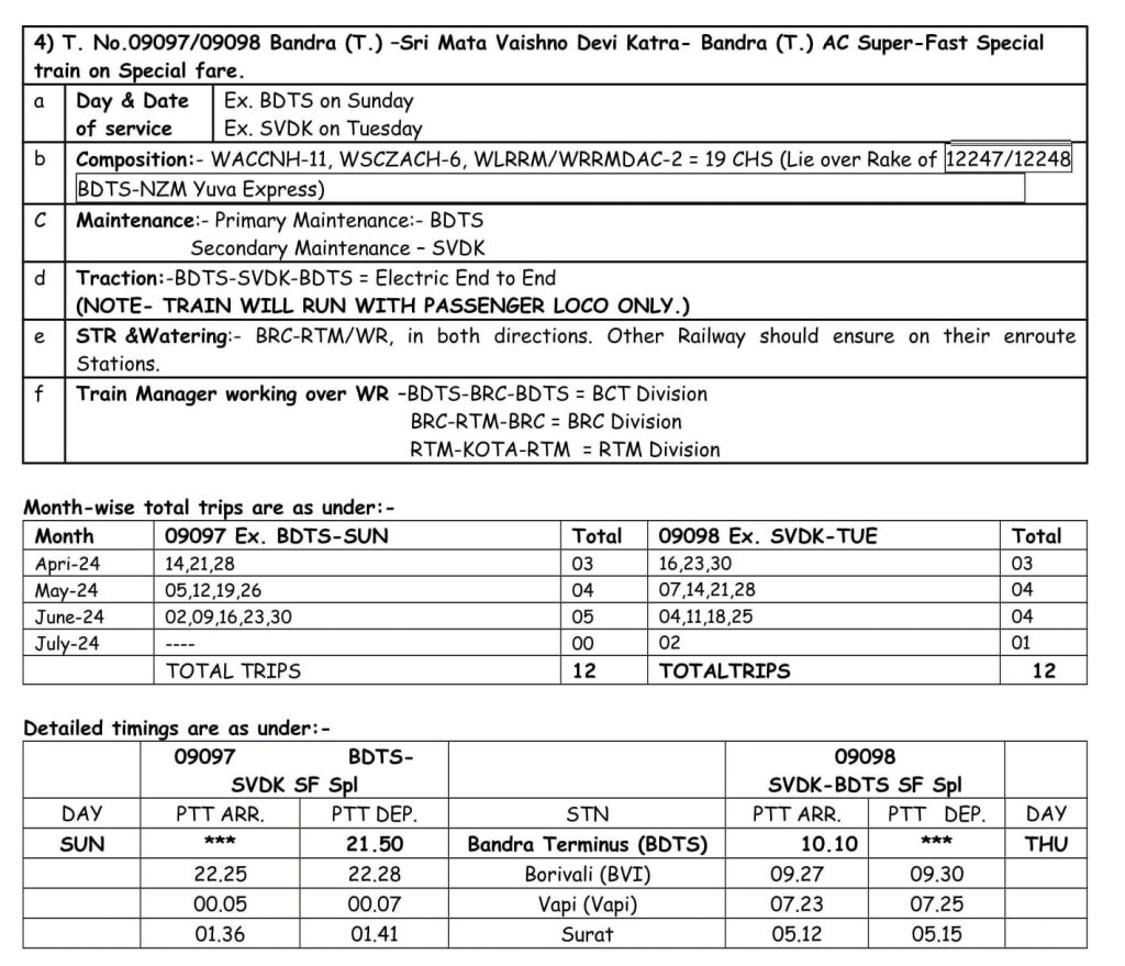 4: 09097/98 बान्द्रा टर्मिनस श्री माता वैष्णो देवी कटरा बान्द्रा टर्मिनस वातानुकूल सुपरफास्ट साप्ताहिक विशेष