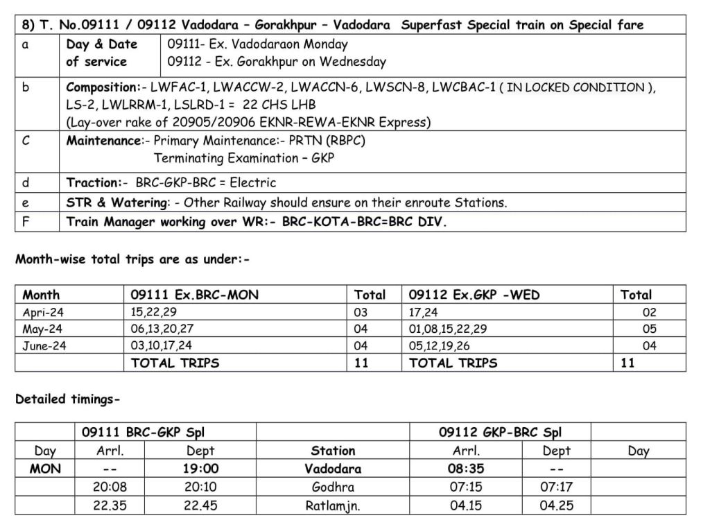 8: 09111/12 वडोदरा गोरखपुर वडोदरा सुपरफास्ट साप्ताहिक विशेष