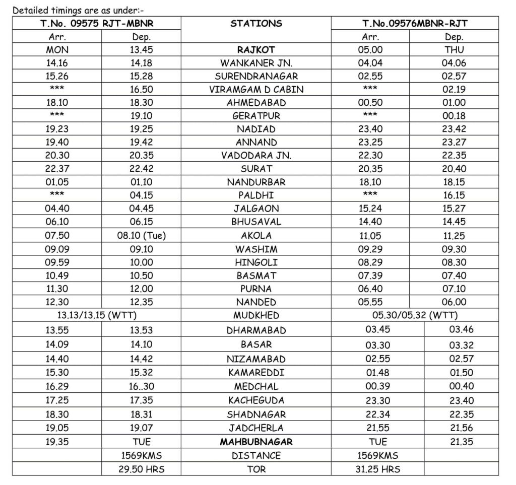 12: 09575/76 राजकोट महबूबनगर राजकोट साप्ताहिक विशेष वाया भुसावल, अकोला, नान्देड़, मुदखेड़, काचेगुड़ा