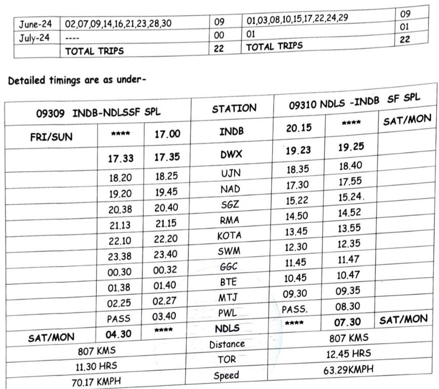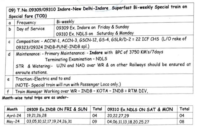 09309/10 इन्दौर नई दिल्ली इन्दौर द्विसाप्ताहिक सुपरफास्ट विशेष वाया देवास, उज्जैन, नागदा, कोटा, मथुरा