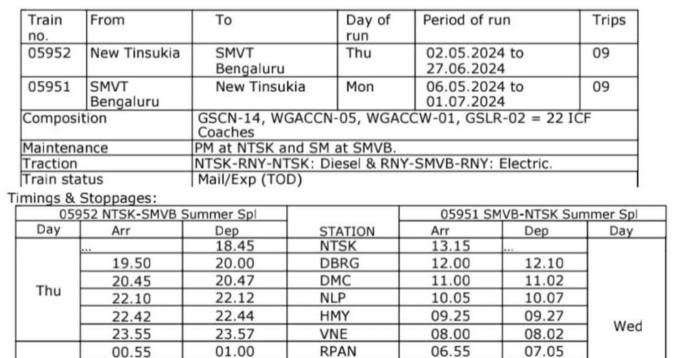 05952/51 न्यू तिनसुकिया सर मोक्षगुंडम विश्वेश्वरैया टर्मिनस बेंगलुरु न्यू तिनसुकिया साप्ताहिक विशेष