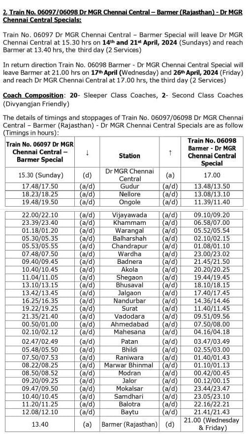 06097/98 पुरुच्ची थलाइवार डॉ एम जी रामचन्द्रन चेन्नई सेंट्रल बाड़मेर पुरुच्ची थलाइवार डॉ एम जी रामचन्द्रन चेन्नई सेंट्रल साप्ताहिक विशेष वाया गुडूर, विजयवाड़ा, बल्हारशाह, वर्धा, भुसावल, सूरत, अहमदाबाद, भीलड़ी, समदड़ी, बालोत्रा
