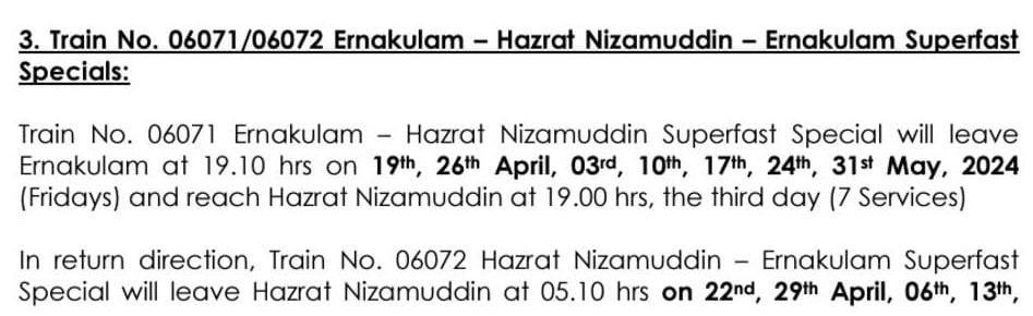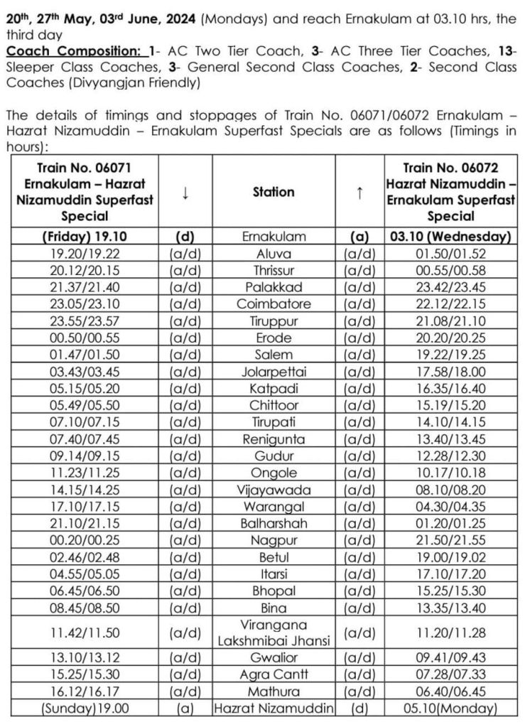 06071/72 एर्नाकुलम हज़रत निजामुद्दीन एर्नाकुलम साप्ताहिक सुपरफास्ट