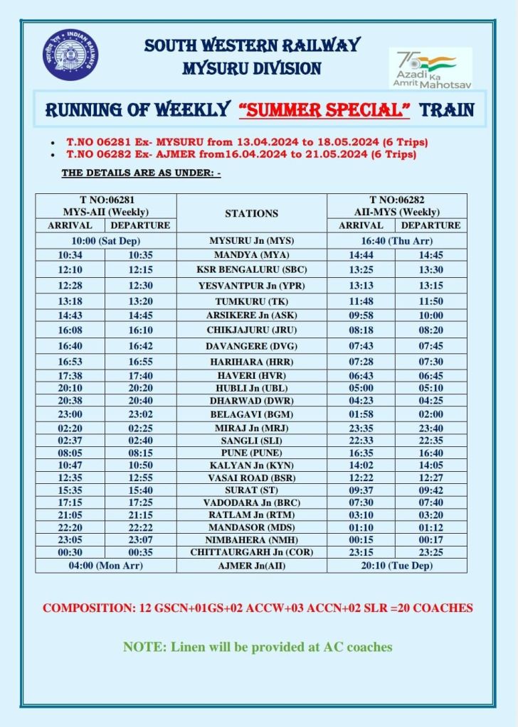 06281/82 मैसूरु अजमेर मैसूरु साप्ताहिक विशेष वाया बेंगलुरु, हुब्बाली, मिरज, पुणे, वसई रोड, वडोदरा, रतलाम, चित्तौड़ गढ़