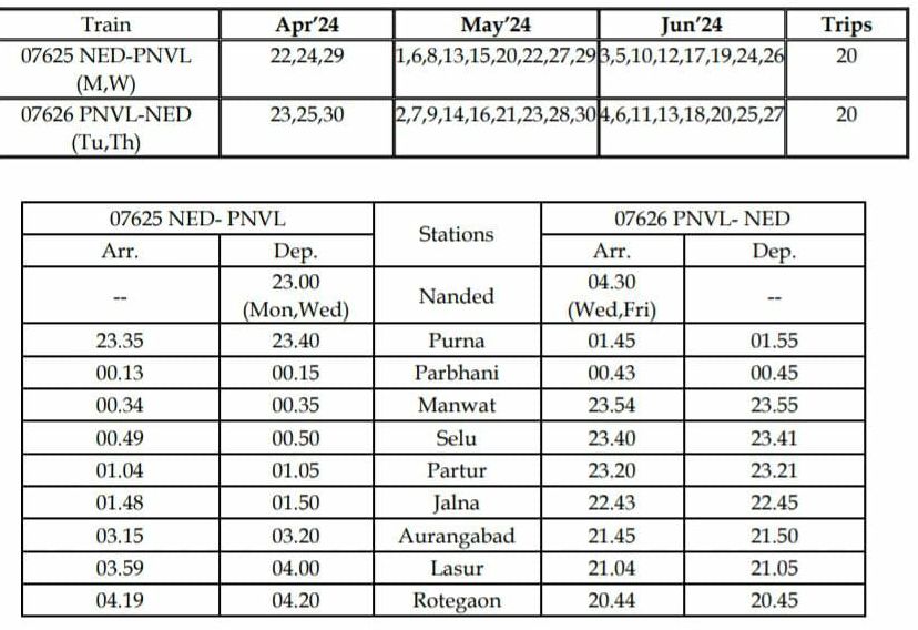 07625/26 नान्देड़ पनवेल नान्देड़ द्विसाप्ताहिक विशेष