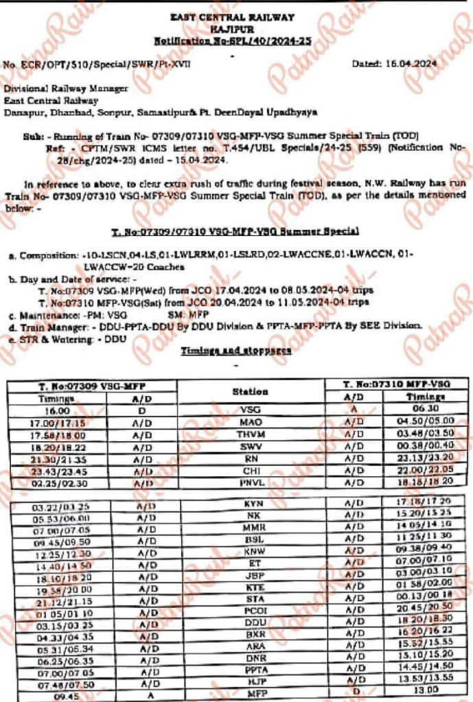 07309/10 वास्को मुजफ्फरपुर वास्को साप्ताहिक विशेष वाया पनवेल, भुसावल, इटारसी, जबलपुर, प्रयागराज छिंवकी, पण्डित दीनदयाल उपाध्याय जंक्शन, पाटलिपुत्र, हाजीपुर