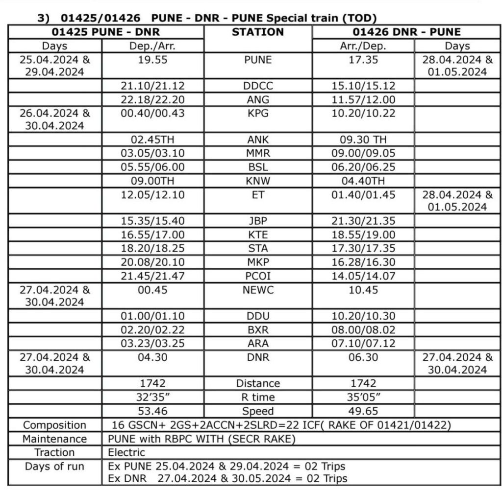 01425/25 पुणे दानापुर पुणे TOD विशेष (2 फेरे) वाया भुसावल, इटारसी, जबलपुर, प्रयागराज छिंवकी, पण्डित दीनदयाल उपाध्याय जंक्शन