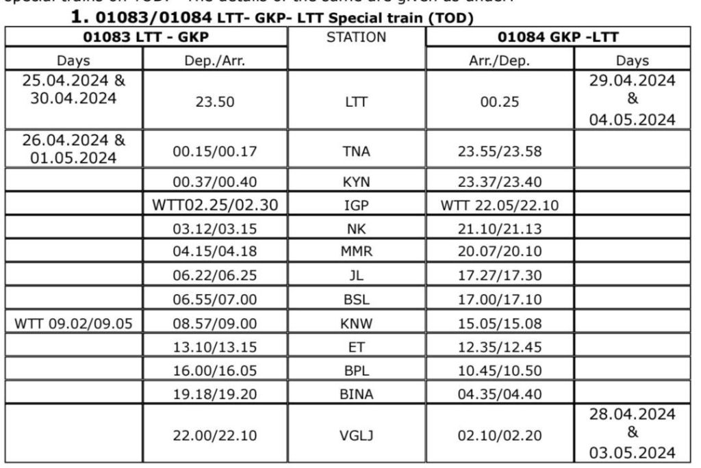 01083/84 लोकमान्य तिलक टर्मिनस गोरखपुर लोकमान्य तिलक टर्मिनस TOD विशेष (2फेरा) वाया भुसावल, इटारसी, बीना, झाँसी, कानपुर, लखनऊ, गोण्डा, बस्ती