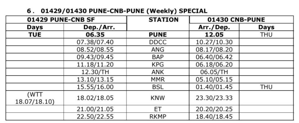 01429/30 पुणे कानपुर पुणे साप्ताहिक विशेष (2 फेरे) वाया मनमाड़, भुसावल, इटारसी, बीना, झाँसी