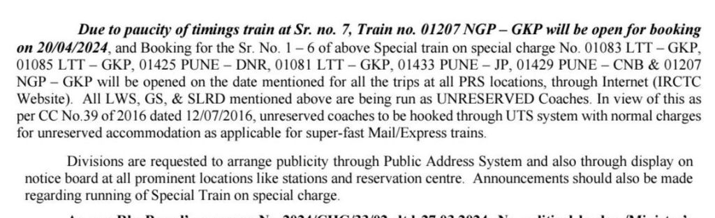 छुट्टियों में जारी यात्रिओंकी भीड़ को देखते हुए, मध्य रेल ने लोकमान्य तिलक टर्मिनस से गोरखपुर, दानापुर के बीच अतिरिक्त गाड़ियोंका प्रायोजन किया है। इसके साथ ही पुणे से दानापुर, कानपुर और जयपुर के बीच भी अतिरिक्त विशेष गाड़ियाँ चल रही है। नागपुर से गोरखपुर के बीच एक जोड़ी विशेष फेरा चलाया जा रहा है। गाड़ियोंका विवरण निम्नलिखित है,