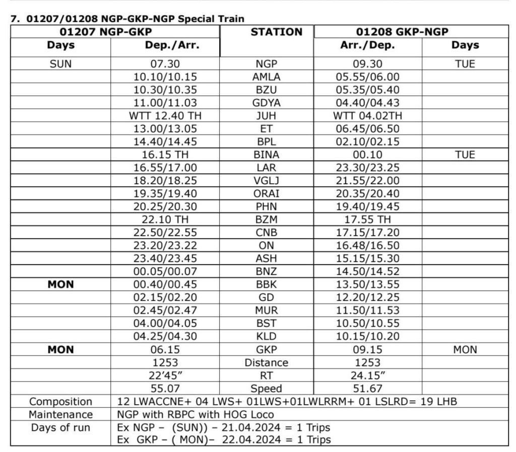 01207/08 नागपुर गोरखपुर नागपुर (1फेरा) वाया इटारसी, बीना, झाँसी, कानपुर, ऐशबाग, गोण्डा, बस्ती