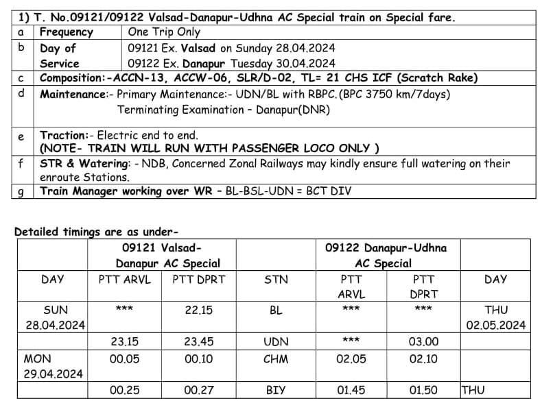 09121/22 वलसाड दानापुर वलसाड वातानुकूल विशेष का एकल फेरा वाया भुसावल, प्रयागराज छिंवकी