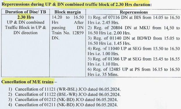 ➡️ढ़ाई घण्टे, दोपहर 14:50 से 16:50 के बीच नॉन-इंटरलॉकिंग ब्लॉक 12859 मुम्बई हावड़ा गितांजली एक्सप्रेस के पास होने के बाद शुरू होगा।