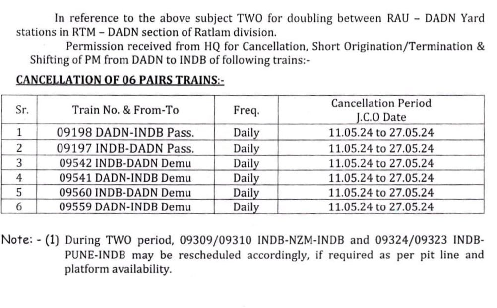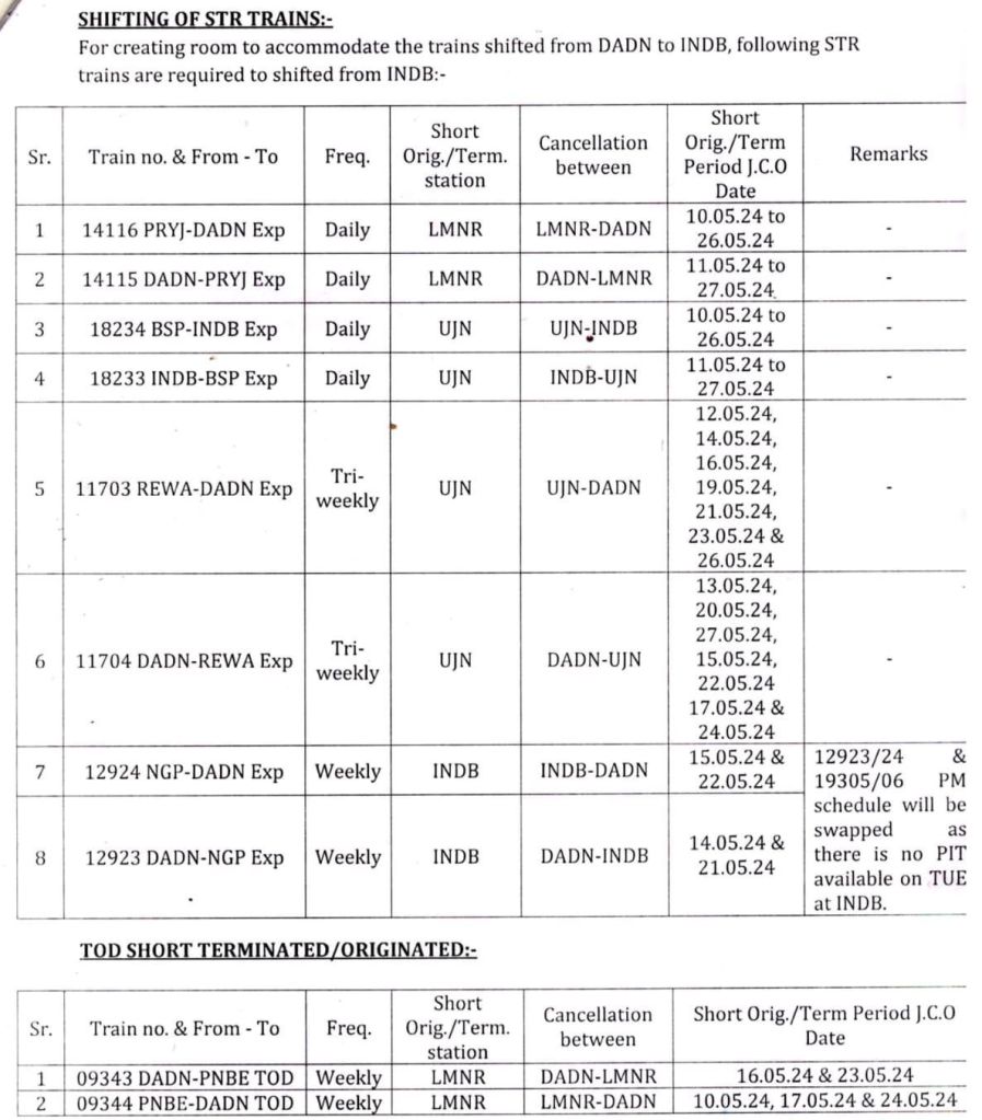निम्नलिखित गाड़ियाँ अपने नियमित, प्रारम्भिक (ओरिजिनेट) /गंतव्य (डेस्टिनेशन) स्टेशन, डॉ आंबेडकर नगर महू की जगह अस्थायी नियोजन किए गए स्टेशन से प्रारम्भ करेगी या समाप्त की जाएगी।