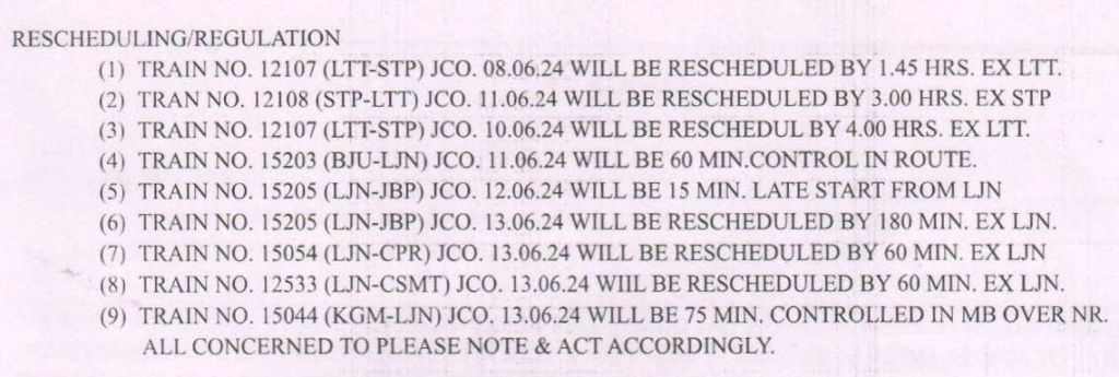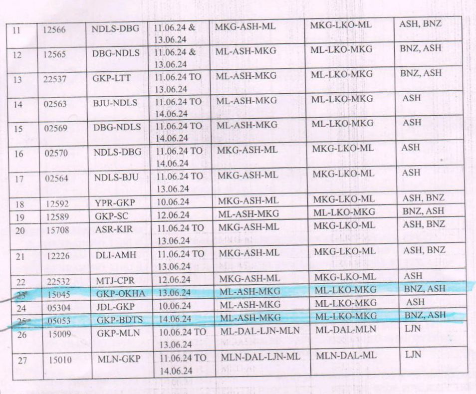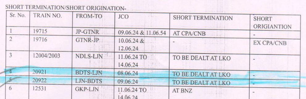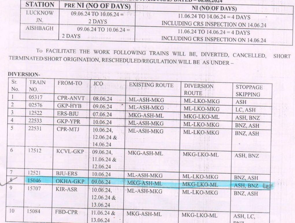 लखनऊ, ऐशबाग से माणकनगर के बीच नए रेल मार्ग का परीक्षण दिनांक 09 जून से किया जा रहा है। यह कार्य 14 जून 2024 तक चलेगा। पूर्वोत्तर रेलवे, लखनऊ मण्डल ने निम्नलिखित गाड़ियाँ बाधित रहेंगी, ऐसे परिपत्रक जारी किया है। यात्रीगण को सूचित किया जाता है, कृपया गाड़ियोंके JCO अर्थात गाड़ी के प्रारम्भिक स्टेशन से छूटने की तिथि समझे और उसके अनुसार अपनी रेल यात्रा का नियोजन करें। अधिक जानकारी के लिए रेलवे हेल्पलाइन 139 का उपयोग करें।