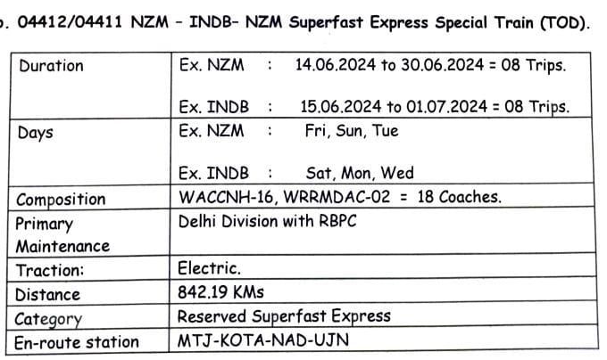 04412 हज़रत निजामुद्दीन इन्दौर सुपरफास्ट विशेष दिनांक 14 जून से 30 जून 2024 तक प्रत्येक शुक्रवार, रविवार एवं मंगलवार को रात 23:15 को चलेगी और अगले दिन दोपहर 12:30 को इन्दौर पहुँचेंगी।