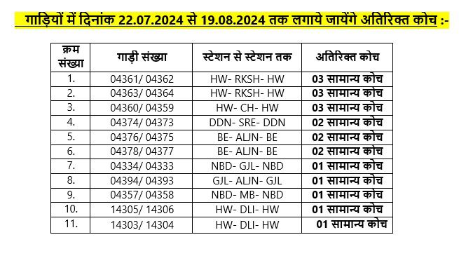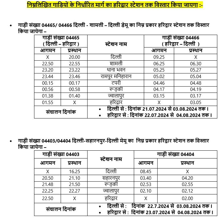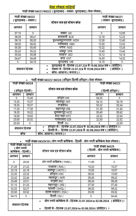 सावन का महीना 22 जुलाई से शुरू हो रहा है। इस माह में कावडियों की सुविधा हेतु हरिद्वार से दिल्ली, लखनऊ, बरैली के बीच और लक्सर – मुरादाबाद के बीच विशेष गाड़ियाँ चलाई जा रही है। दिल्ली से शामली, सहारनपुर के बीच चलनेवाली नियमित गाड़ियोंका हरिद्वार तक विस्तार, 11 गाड़ियोंमे सामान्य कोच बढ़ाए जा रहे है।
