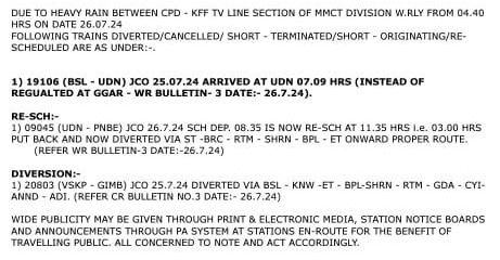 आंशिक रूप से रद्द:- 1) 09096 (नंदुरबार-सूरत) दिनांक 26.07.24 खटगांव आगमन समय 05.43, खटगांव-सूरत के बीच रद्द।