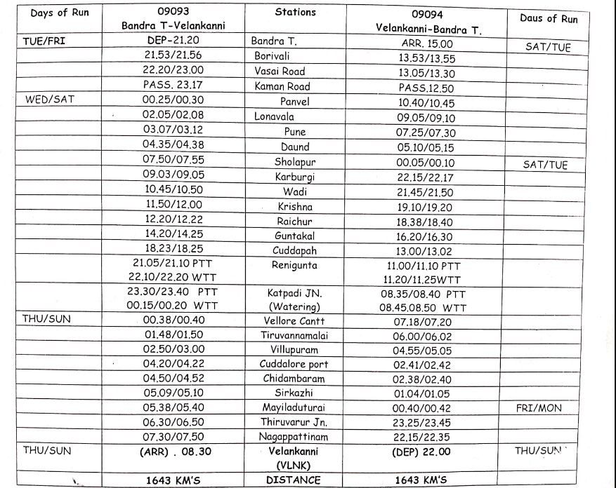 साप्ताहिक विशेष 09093/94 बान्द्रा टर्मिनस – वेलांकिन्नी – बान्द्रा टर्मिनस साप्ताहिक विशेष