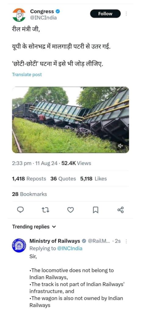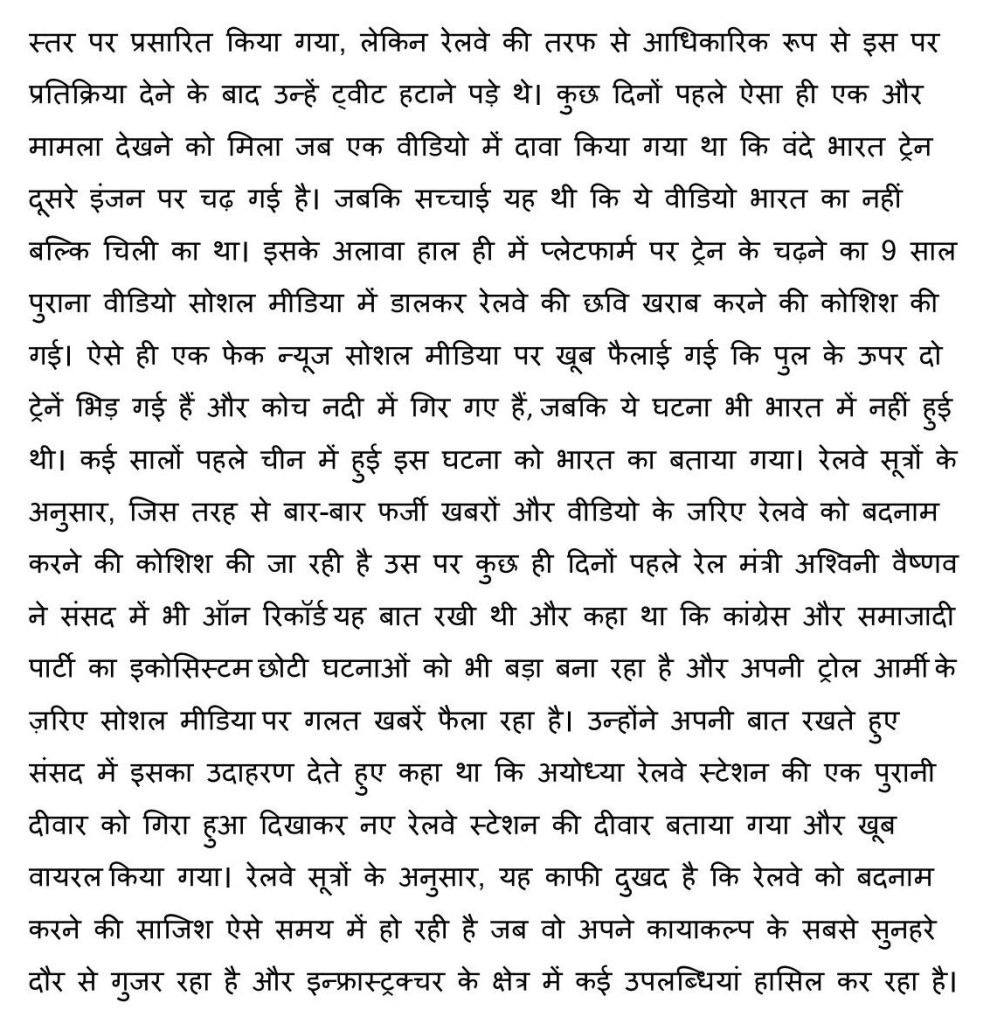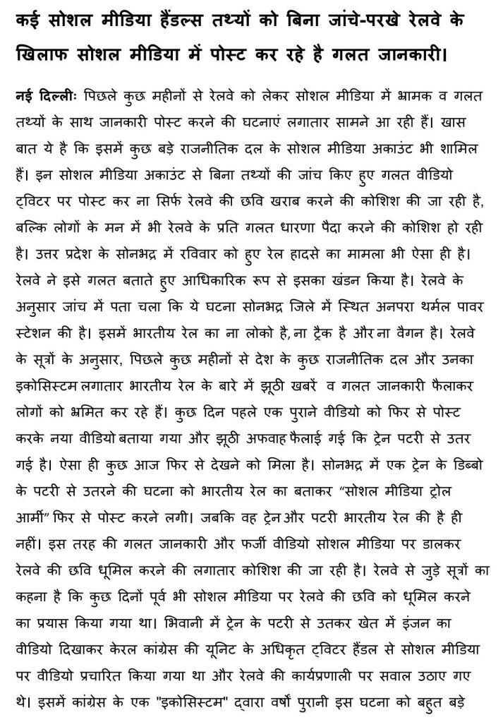आजकल सोशल मीडिया का उपयोग अवांछनीय तरीके से किया जाने लगा है। भारतीय रेलवे ने इस पर बड़ी आपत्ति उठाई है। रेल प्रशासन ने आज एक ‘प्रेस ब्रीफ’ जारी किया है, उसे हम यहाँपर यथावत, जस की तस प्रस्तुत कर रहे है।