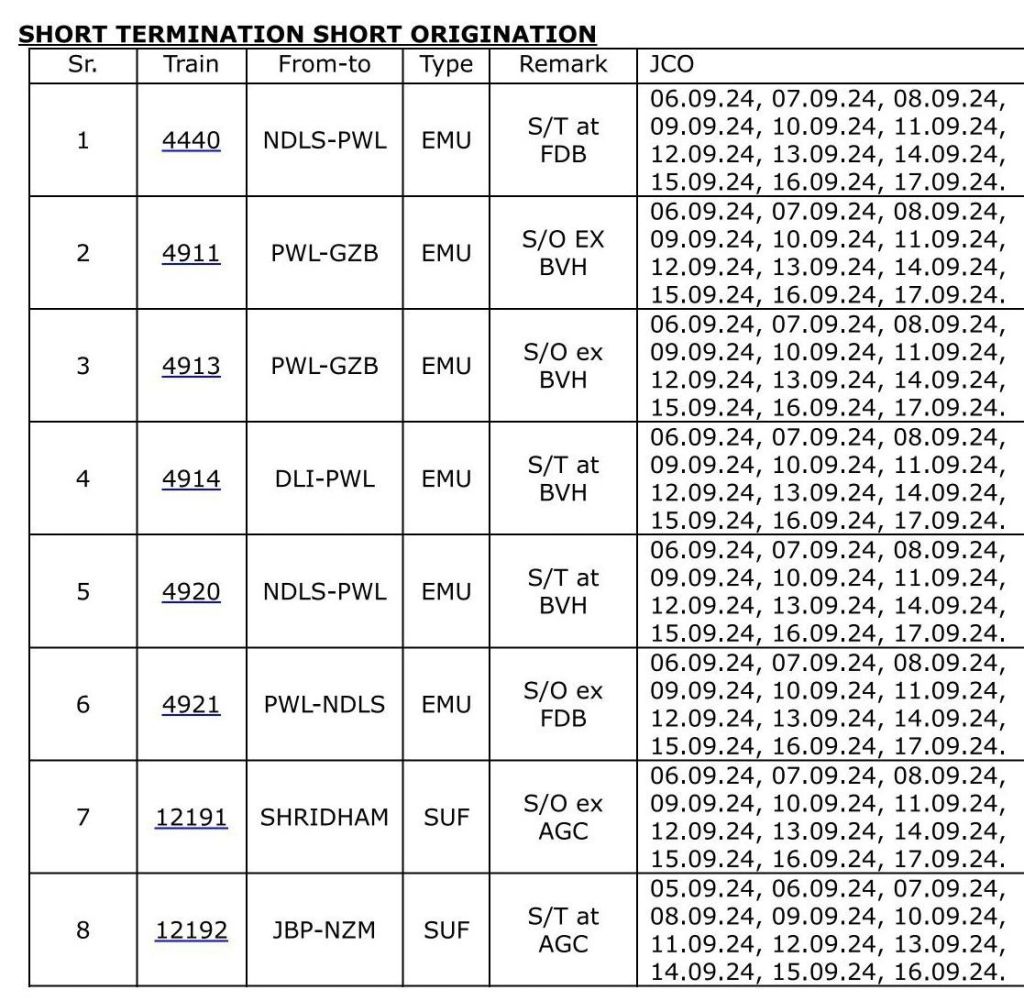 04965/66 पलवल नई दिल्ली पलवल दि. 06/9 से 17/9 तक रद्द
